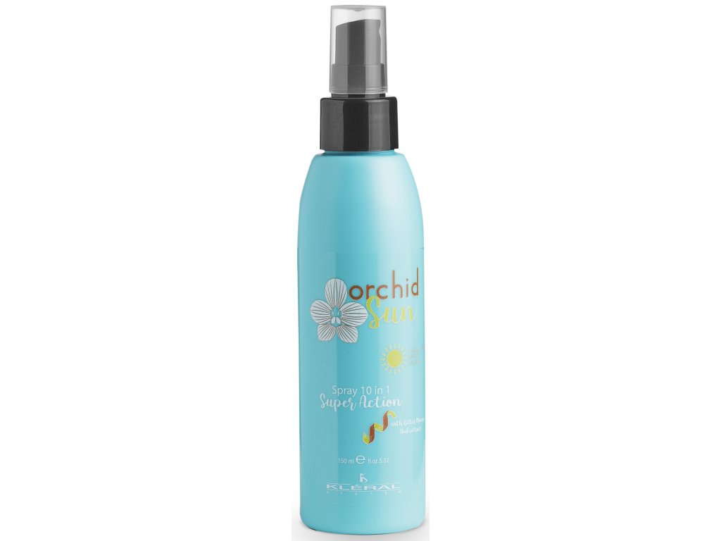Kléral Orchid Sun 10 in 1 Super Action Spray je hedvábně jemný bezoplachový sprej s rostlinným keratinem, který poskytuje vlasům až 10 účinků v jednom kroku. Okamžitě usnadňuje rozčesávání, zjemňuje a dodává vlasům lesk. Vhodný pro poškozené, suché a sluncem zatížené vlasy – ideální pro použití po umytí nebo přímo na pláži.
