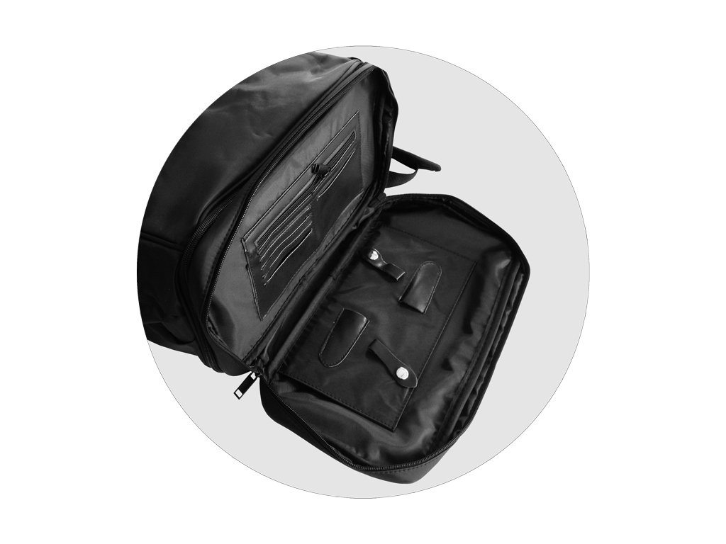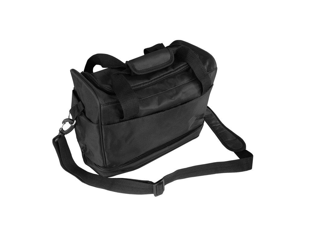 V dolní části úložný prostor se zipem s přihrádkami pro nůžky a drobné pomůcky. Z vnějšku tašky jsou z každé strany kapsy (jedna z nich síťkovaná). Vně tašky na jedné straně 3 přihrádky a na druhé velká kapsa. Odepínatelný popruh přes rameno