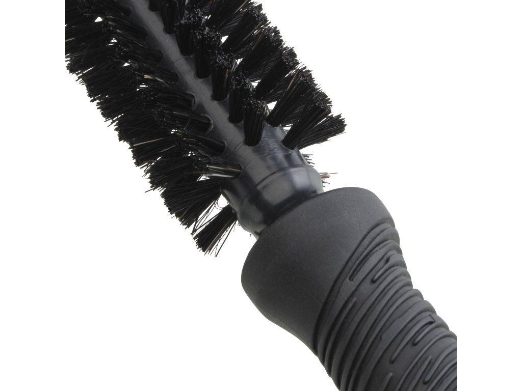 Kartáč je vybaven prodlouženou ergonomickou rukojetí s protiskluzovou úpravou. Tato rukojeť je navržena tak, aby poskytovala maximální komfort při dlouhodobém používání a umožnila pevný úchop i během intenzivní práce. Na rukojeti jsou navíc speciální vrypy v oblasti palce, které zvyšují stabilitu při manipulaci, což zajišťuje větší přesnost při stylingu. Tato ergonomická rukojeť minimalizuje únavu ruky a zápěstí, což je klíčové při práci s více klienty.