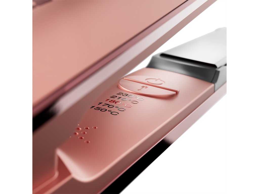 - 5 nastavitelných teplotních stupňů: Možnost volby teploty od 150 °C do 230 °C (150 °C, 170 °C, 190 °C, 210 °C, 230 °C), což umožňuje přizpůsobení pro různé typy vlasů.